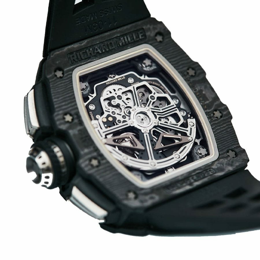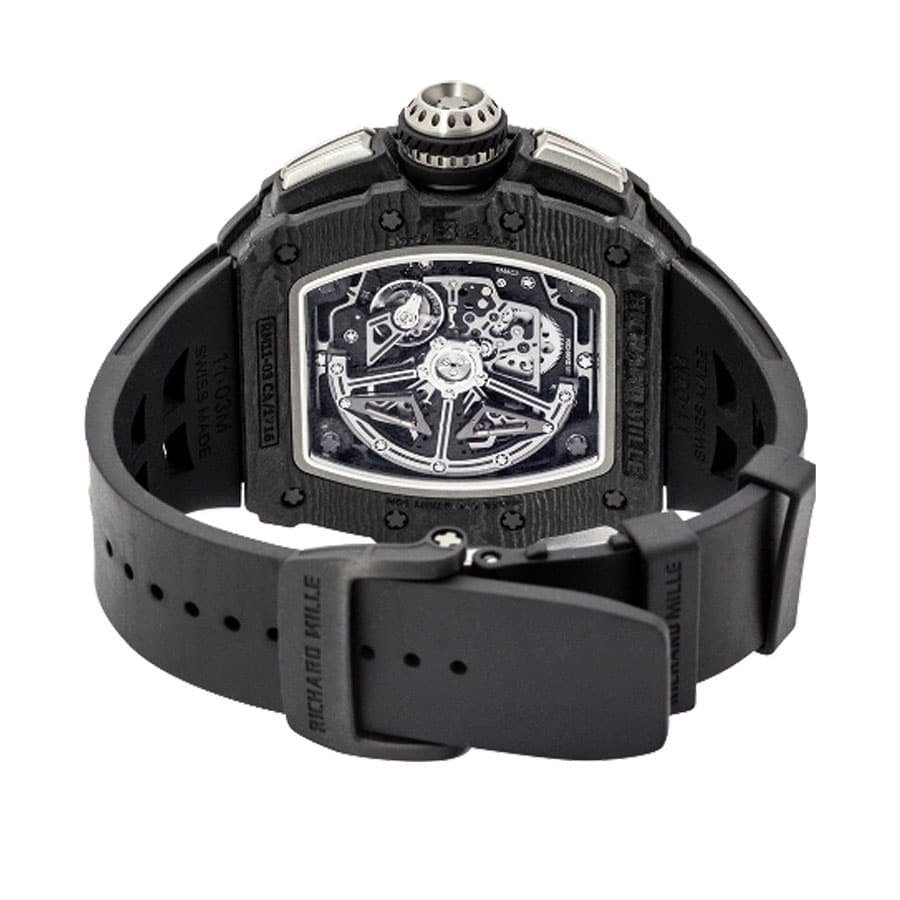 The Richard Mille RM11-03 Automatic Winding Flyback Replica is a luxurious watch that is sure to impress. The movement is an automatic caliber RMAC3 with a power reserve of 60 hours and a precision of -3/+3 seconds per day within COSC certification limits. The case is made of carbon and is black in color. with a sapphire crystal and a thickness of 16.23 mm. The bracelet is made of rubber and is adjustable for all sizes. with a 904L stainless steel double-fold clasp.