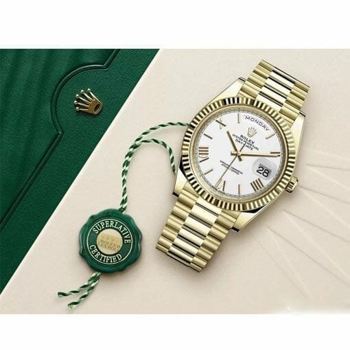 The Rolex Day-Date II Collection Gold White Roman Dial 218238-0037 Replica is a luxurious watch that is sure to impress. It features a 904L stainless steel case with a yellow gold finish. a sapphire crystal. and a 41.00mm size and 12.00mm thickness. The bracelet is also made of 904L stainless steel with an adjustable link and a folding clasp in yellow gold. The dial is white with Roman numerals and stick hour markers and hands.