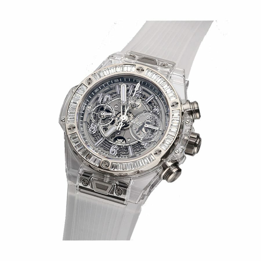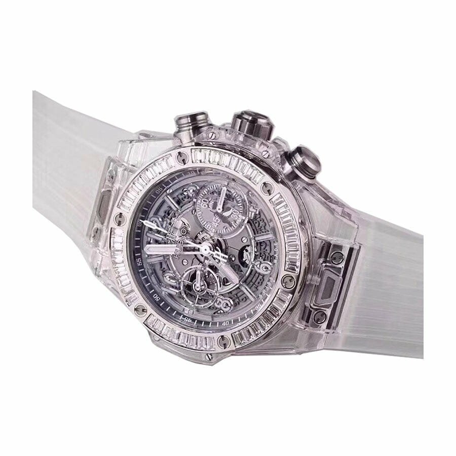 The Hublot Big Bang Unico Sapphire Baguettes 411.JX.4802.RT.1904 Replica is a luxury watch. It features an automatic movement with a HUB1242 UNICO caliber and a power reserve of 60 hours. The case is made of sapphire and is skeleton colored. while the bezel is gem-set and also skeleton colored. The bracelet is made of rubber and is adjustable for all sizes. with a stainless steel deployant clasp.